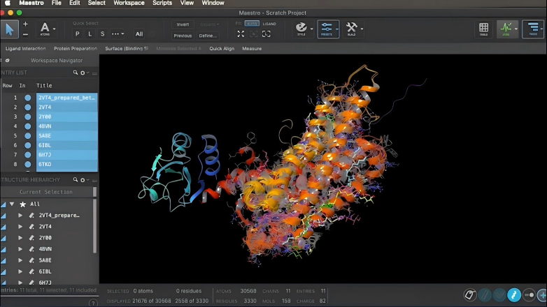 Desmond是一个高性能的分子动力学模拟程序,用于研究生物体系在原子水平上的动态行为与时间演化过程。生物分子是动态的,其功能往往与运动密切相关。Desmond使研究人员能够模拟蛋白质、核酸、脂质膜等体系在接近生理条件下的动态过程,时间尺度可达微秒甚至毫秒级。它可以揭示诸如蛋白构象变化、配体结合路径、蛋白蛋白相互作用等静态结构无法捕捉的信息。Desmond以其卓越的计算性能(支持GPU加速)、高数值精度和与常用力场(如OPLS, AMBER, CHARMM)的兼容性而著称。它与Maestro无缝集成,简化了复杂的模拟设置(如自由能微扰计算)和结果分析流程。