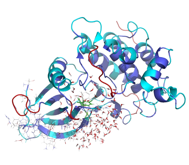 | Fig. Desmond的混合溶剂分子动力学(MxMD)通过分析探针占位情况,可绘制结合热点图谱揭示隐蔽口袋,并评估靶标表面的"可成药性"。 | Fig. 利用FEP+对缺乏实验结构或基于低分辨率结构的蛋白质模型进行验证 |