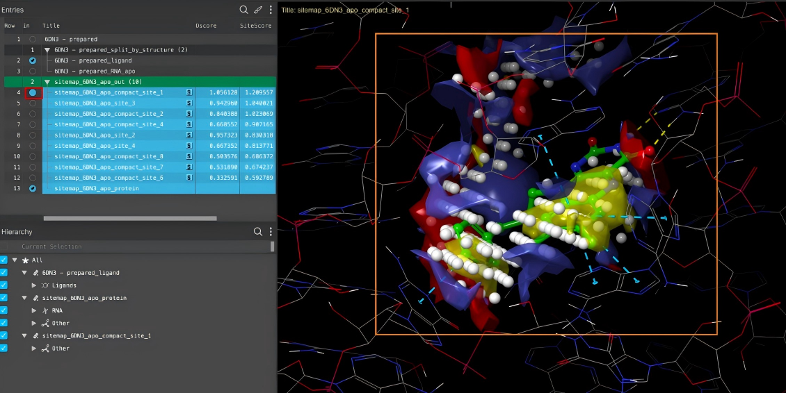 SiteMap是一个用于预测和评估蛋白表面的潜在配体结合位点的工具。当对一个新靶标的活性位点位置不确定时,SiteMap是首要的分析工具。它通过探测蛋白表面的形状、疏水性和氢键能力等物理化学属性,来识别出所有可能的结合口袋,并使用SiteScore对它们的“成药性”进行排序。其输出结果不仅能高亮显示主要的活性位点,还能识别潜在的变构位点。SiteMap生成的三维等高线图可以直观地指导用,它与Glide无缝集成,可直接将识别出的位点用于对接格点的设置。除了影响先导化合物的发现外,SiteMap 还能帮助研究人员优化先导化合物,深入了解潜在的配体-受体相互作用,从而指导先导化合物的改造,提高其结合效力。