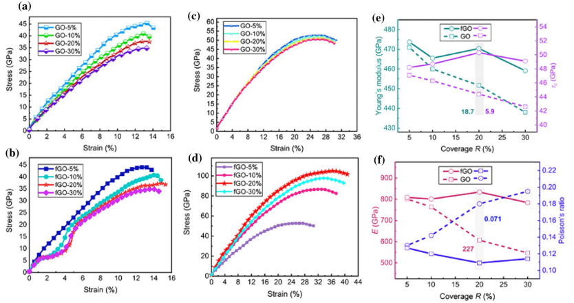 图4 (a-b) 拉伸应力-应变曲线;(c-d) 压缩应力-应变曲线;(e) 杨氏模量和固有强度;(f) GO和fGO弹性模量和泊松比