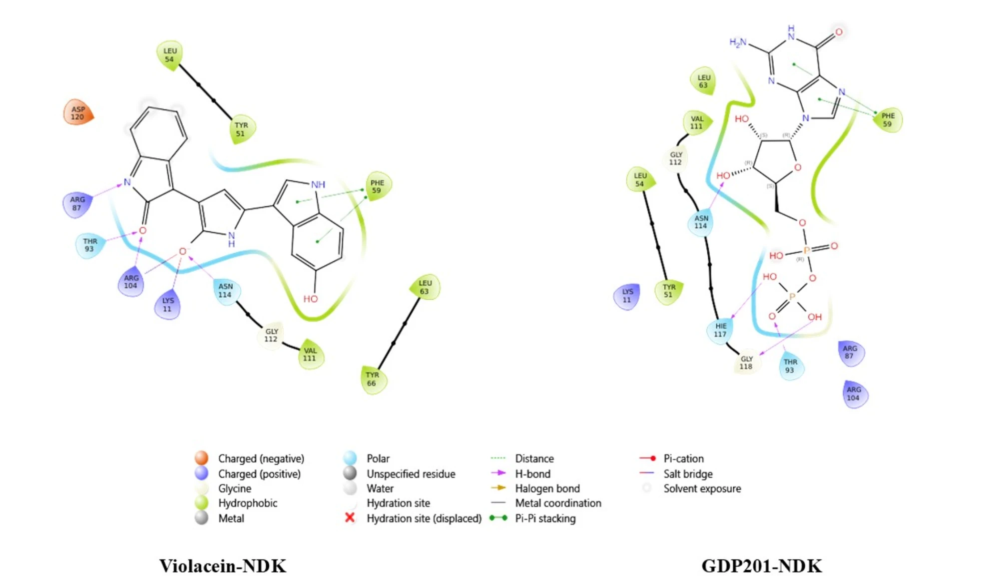 图注:紫杆菌素和参照配体与Ndk蛋白的2D相互作用图