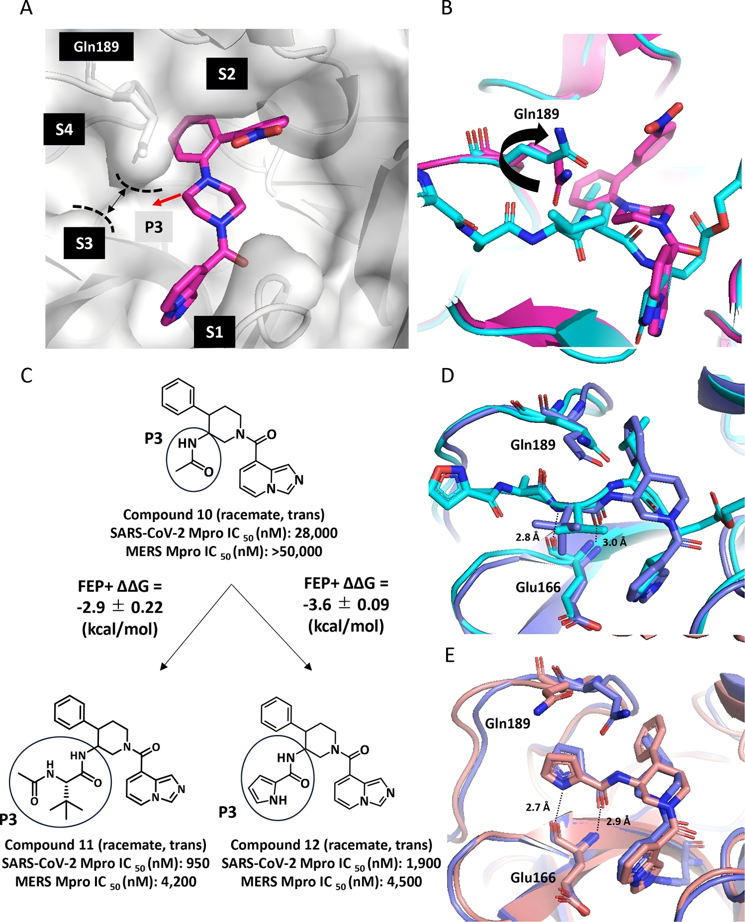 针对S3口袋,为评估在哌啶核心引入P3取代基的效果,使用了SARS-CoV-2 Mpro与化合物4形成复合物的晶体结构,并在Maestro中手动绘制哌啶核心上的P3取代基,将其作为FEP+计算的初始结构