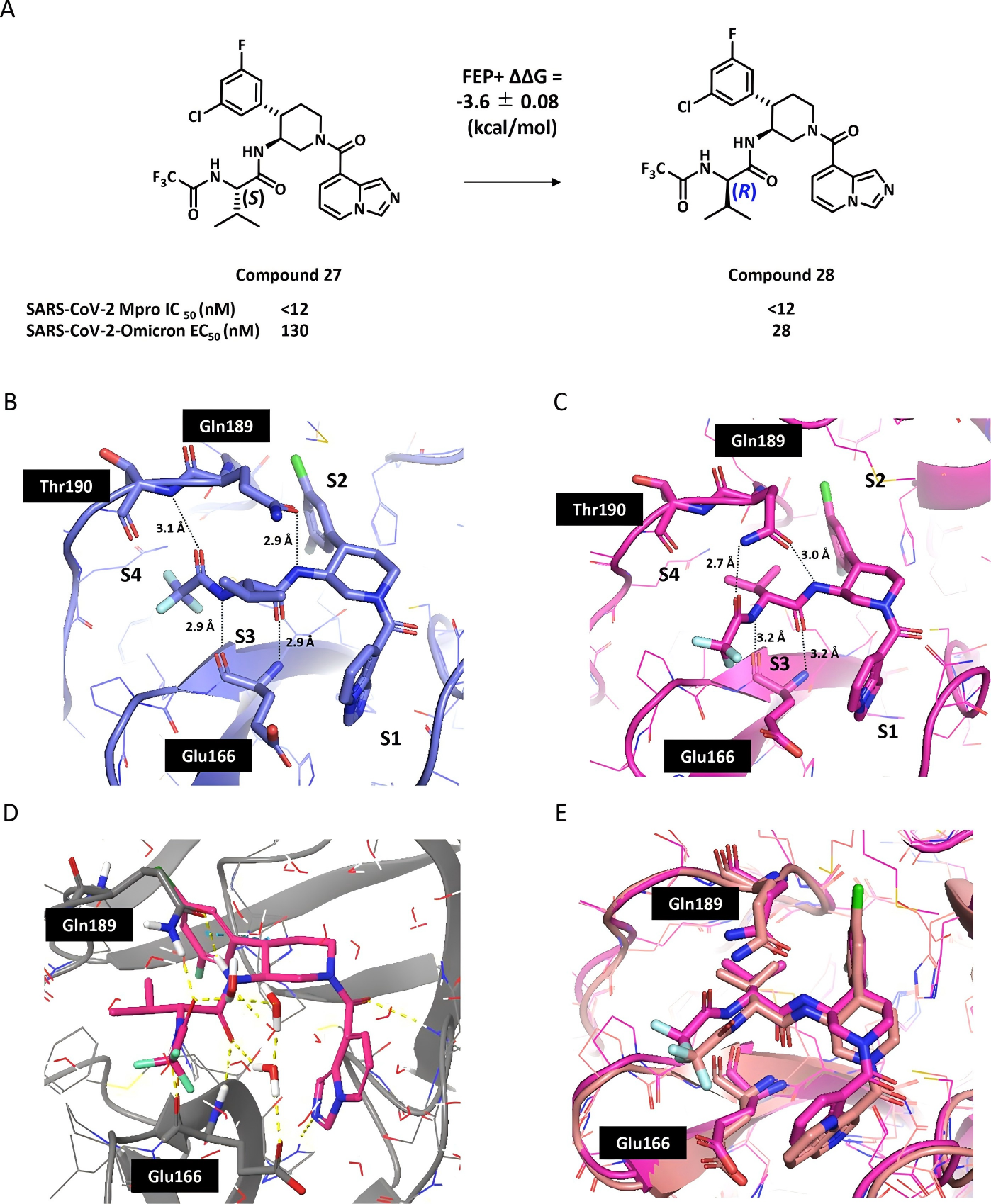 研究人员通过大规模FEP+计算进行了性能验证,7330个化合物通过LiveDesign自动运行,计算以SARS-CoV-2 Mpro与化合物12的复合物晶体结构为参照,通过Glide SP进行核心约束对接,生成输入构象(pose)。85个化合物进入合成阶段。
