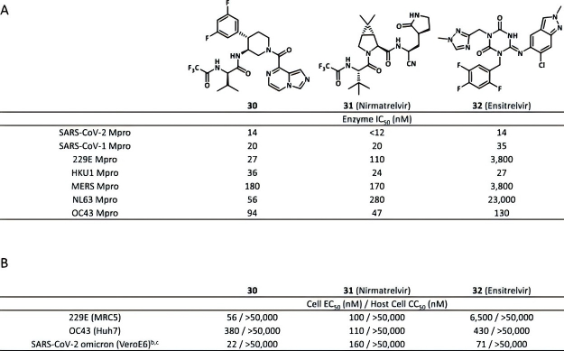 研究人员通过虚拟筛选识别出了一种以哌嗪为核心的非共价命中化合物。基于结构指导的骨架变形产生了一种新型三取代哌啶核心结构。在考虑Met49/Met165和Gln189诱导契合的条件下,通过FEP指导设计,成功筛选出强效的化合物30。该化合物不仅具有泛冠状病毒Mpro抑制活性,还对SARS-CoV-2奥密克戎变异株展现出细胞抗病毒效力。