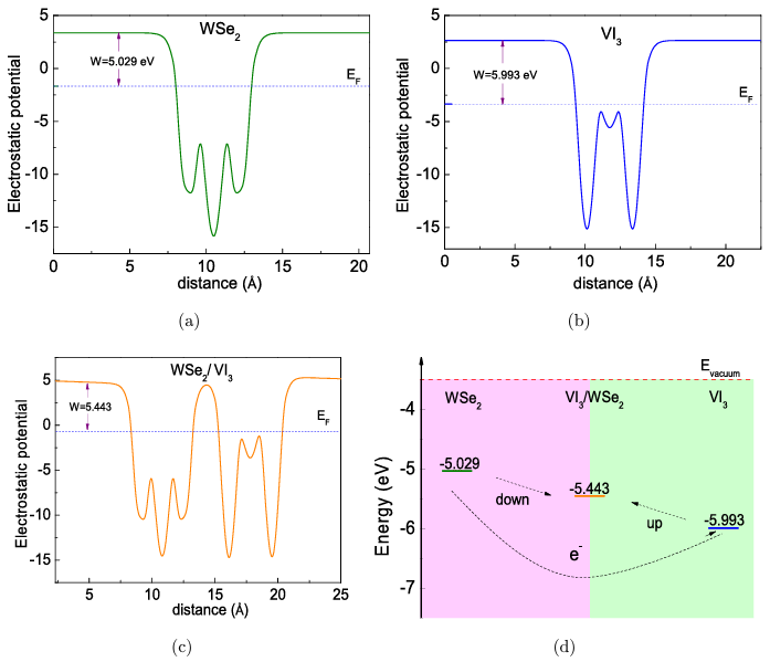 图3 (a) VI3功函数;(b) WSe2功函数 (c) VI3 / WSe2异质结功函数; (d) VI3 / WSe2异质结电子转移方向